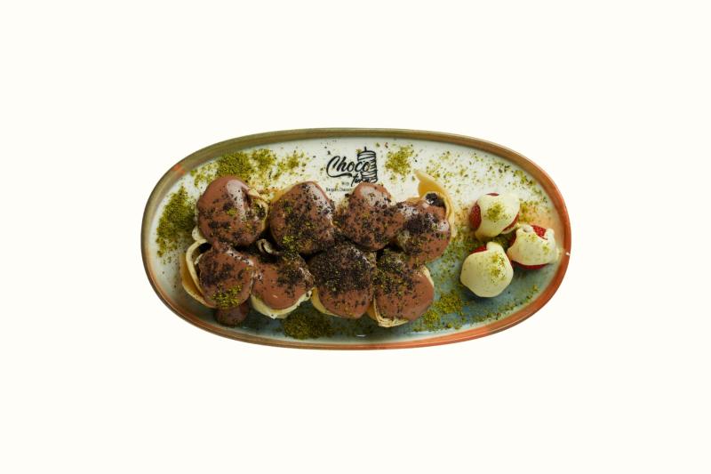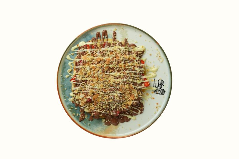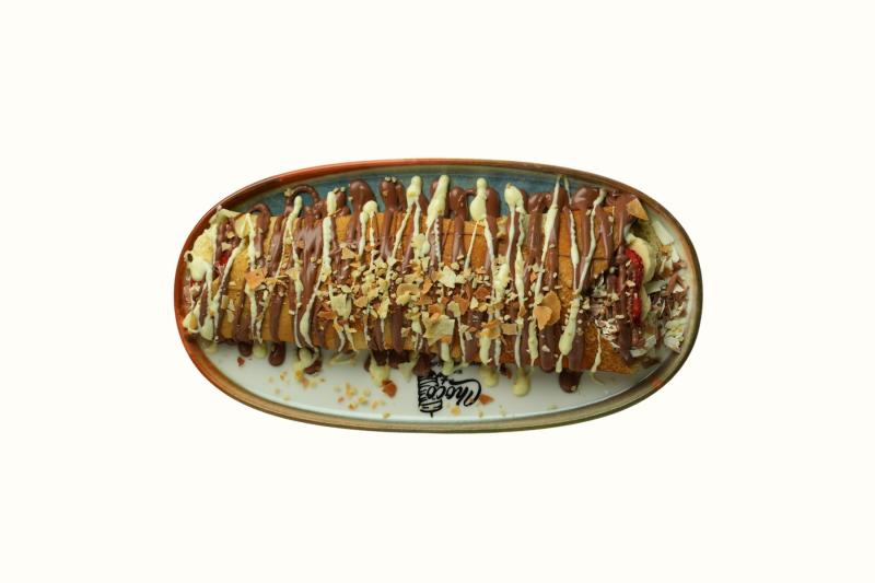 Krep hamuru, çilek, muz, çikolata döner parçacıkları, krep kırığı, fındık, sütlü ve beyaz belçika çikolatası ile servis edilir.