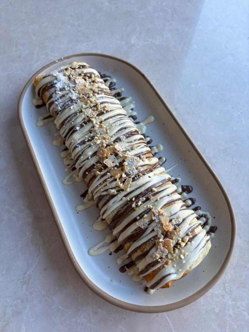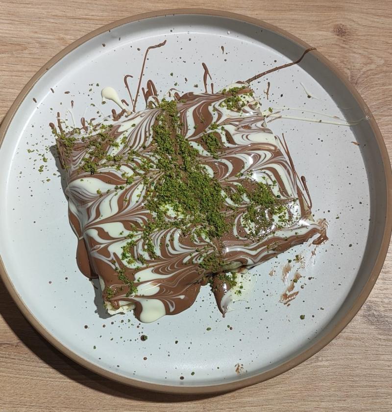 Özel krep hamurunun Fettucini şeklinde doğranır, muz ve çilek konulur. Üzerine sütlü ve beyaz çikolata dökülür. Krep kırığı ve fındık parçacıkları serpiştirilerek servis edilir. (+Dondurma 30TL)