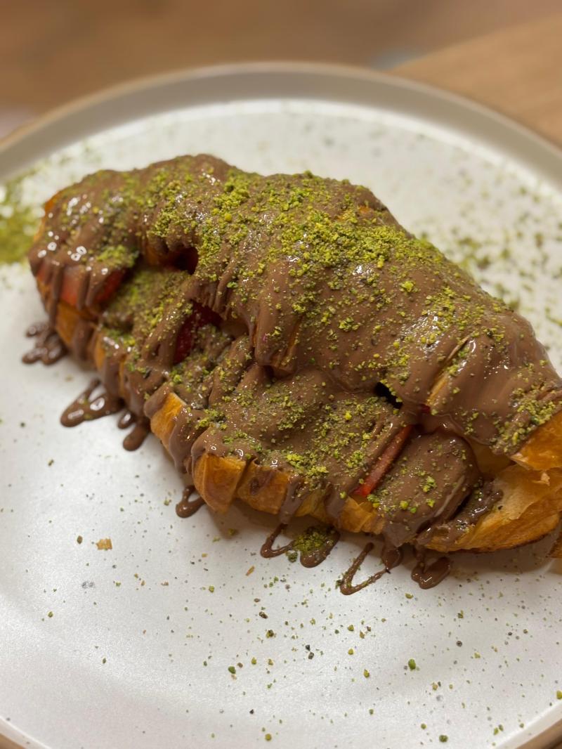 Kruvasan İçerisine Özel Pastacı Kreması, Muz, Çilek Ve Üzerine Antep Fıstığı İle Servis Edilir.