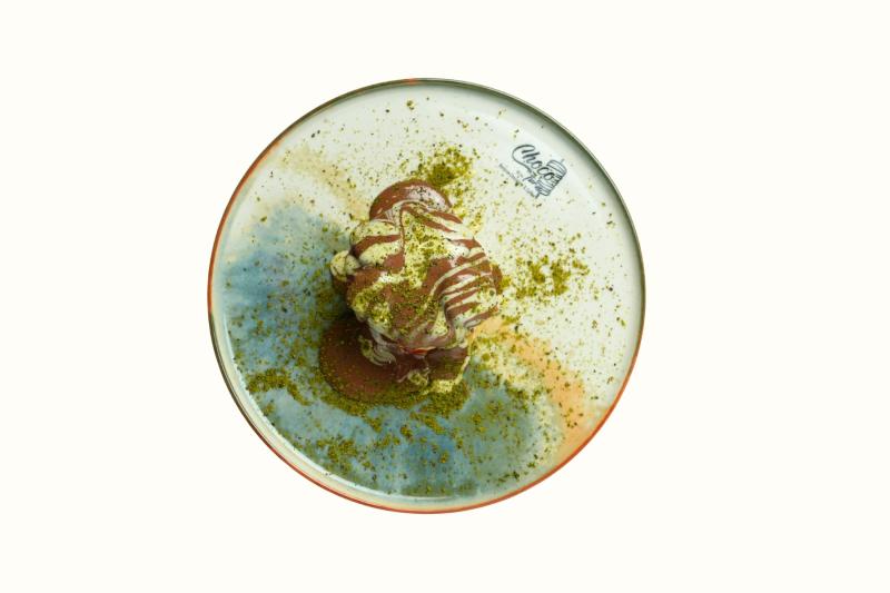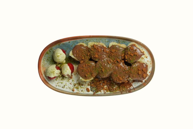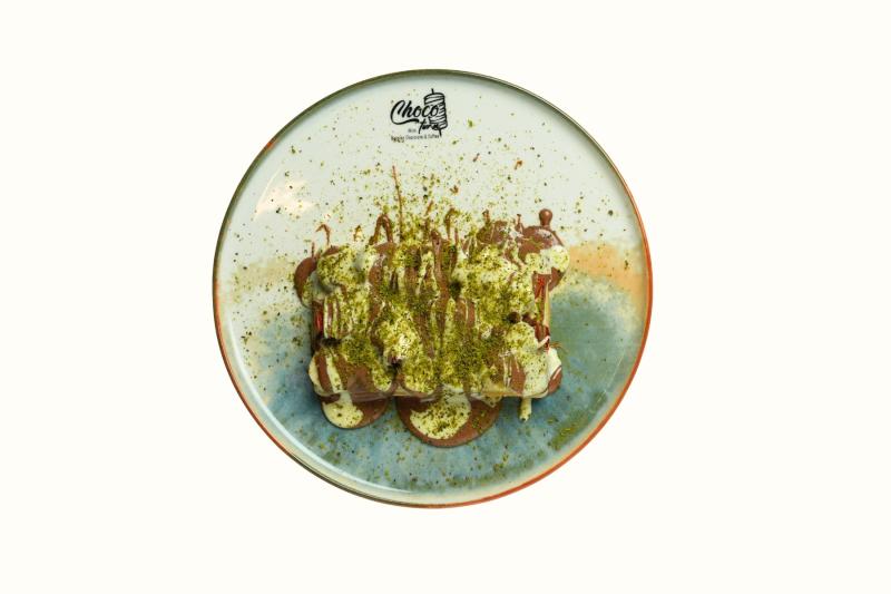 Mini pankeklerin üzerine antep fıstığı tozu, muz ve çilek konulur. Üzerine sütlü ve beyaz klasik çikolata dökülür ve servis edilir..(12 adet pankek)