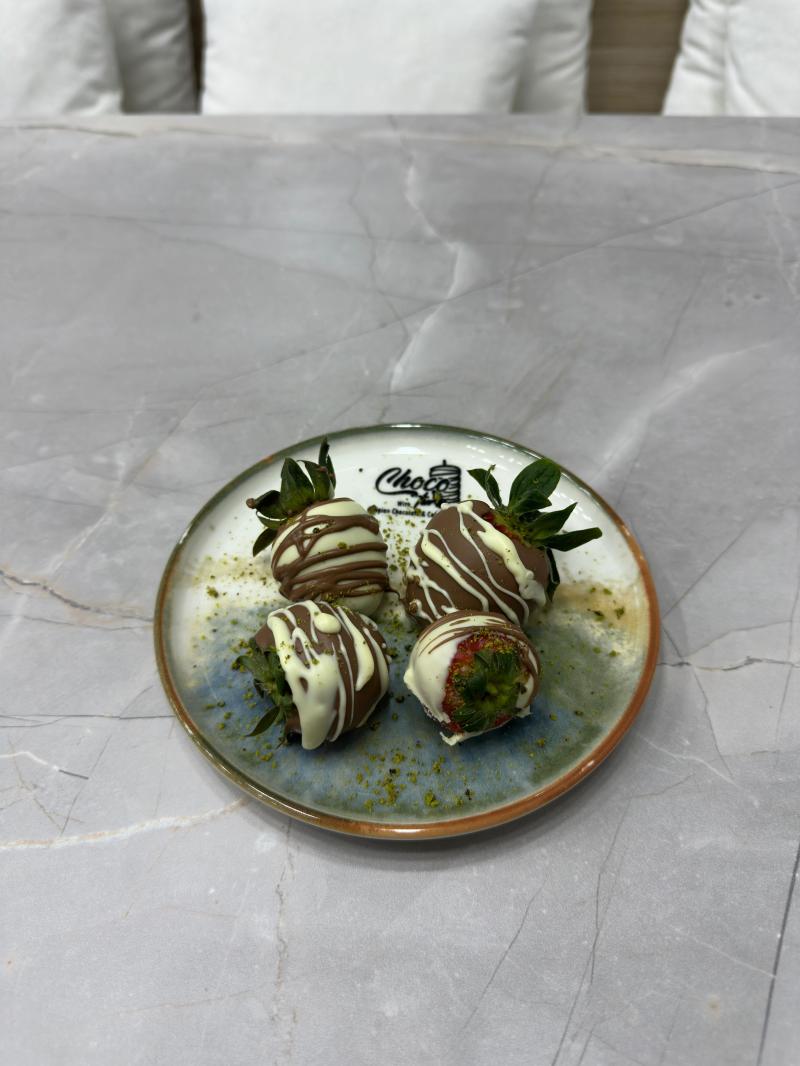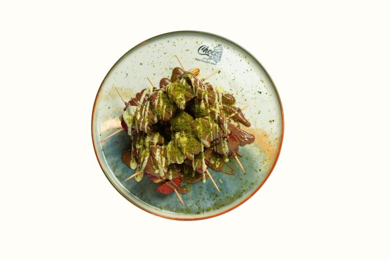 Pankek, muz ve çilek çubuğa dizilir. Üzerne sütlü ve beyaz çikolata dökülür. Antep fıstığı parçaları serpiştirilerek servis edilir. (5 Adet Çöp şiş)