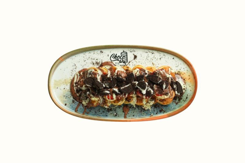 Mini pankeklerin üzerine oreo parçacıkları, muz ve çilek konulur. Üzerine sütlü ve beyaz çkolata dökülür. Oreo tozu serpiştirilerek servis edilir.(12 adet pankek)