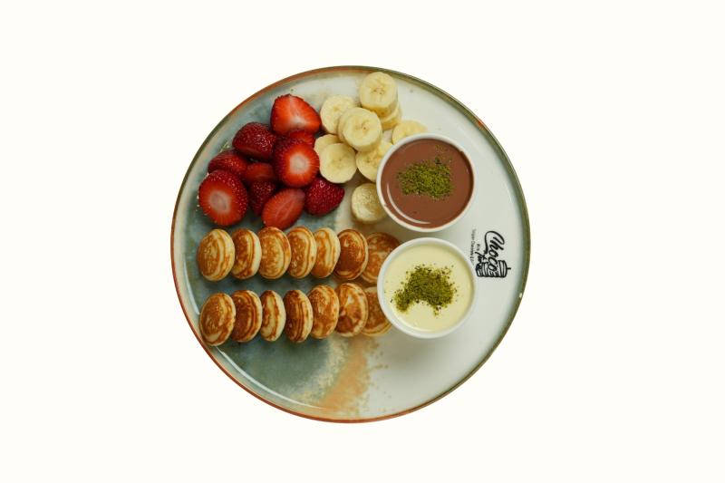 Mini pankekler, muz, çilek, sütlü ve beyaz çikolata ile servis edilir.(16 adet pankek)