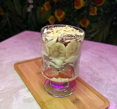 Bardak içerisine muz, çilek, krep kırığı ve sütlü çikolata eklenir. Üzerine krep kırığı ve fındık parçacıkları serpiştirilerek servis edilir.