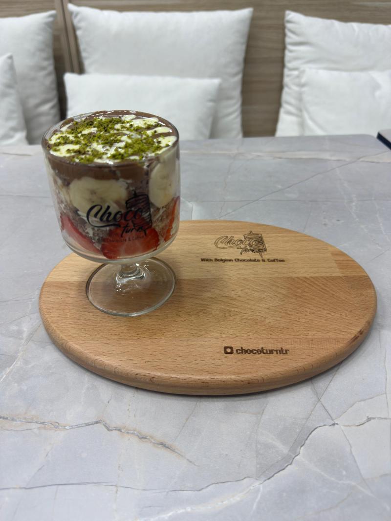 Belçika Çikolatası ,muz,çilek,krep kırığı ve fındık parçacıkları ile servis edilir.